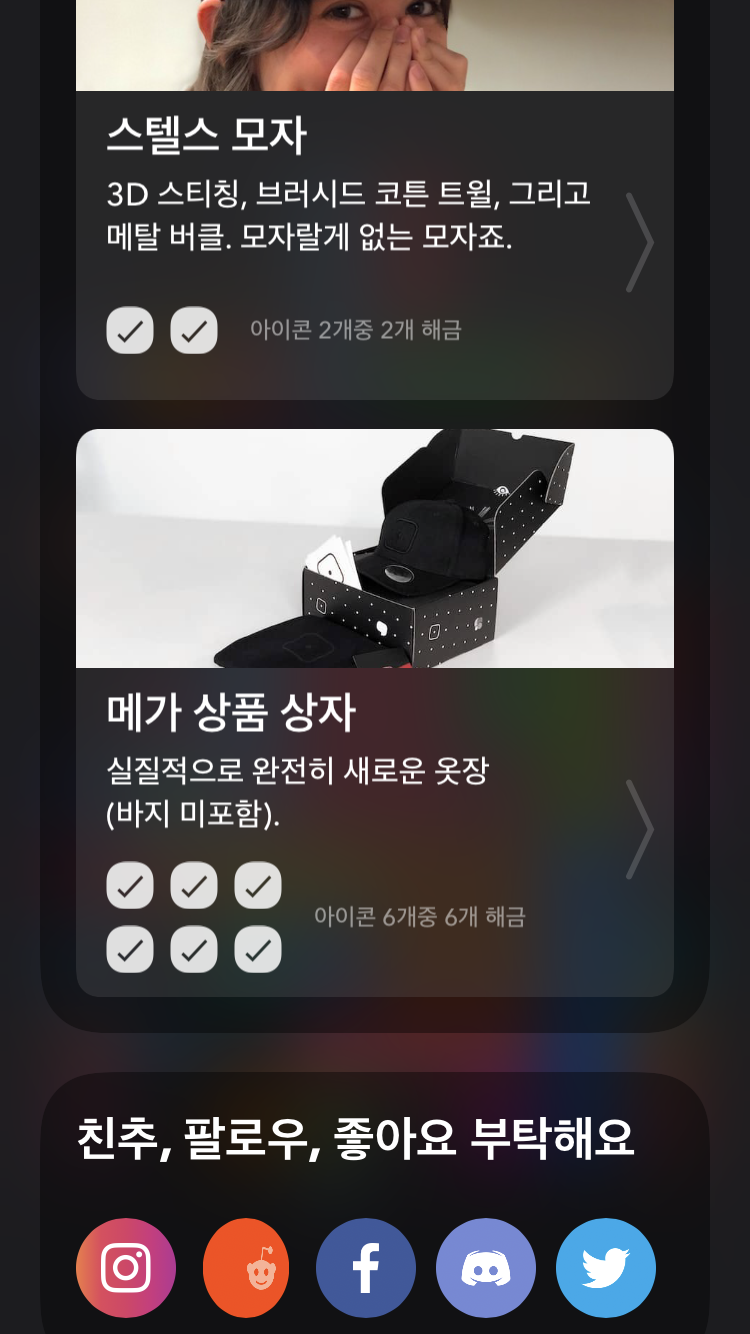 챌린지 목록(홈 그리드) >> 링크 추가기능 UI/상점 설명 >> 링크 굿즈 상점 Blackbox의 로고가 새겨진 미니멀리즘 굿즈와 어패럴을 판매하고 있습니다. 처음 상점이 열렸을 경우 들어가보면 일부 항