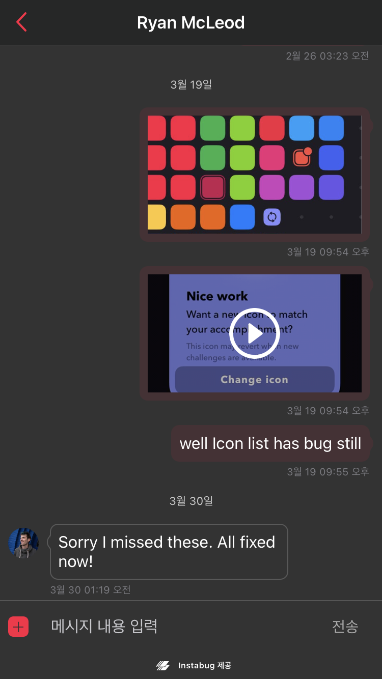 챌린지를 모두 클리어하면 말풍선(Speech Bubble)이 나타납니다. 이 버튼은 버그 리포트 메신저로 개발자 Ryan에게 화면 기록, 캡쳐와 함께 상세한 버그 설명이 가능한 채팅을 보낼 수 있습니다.