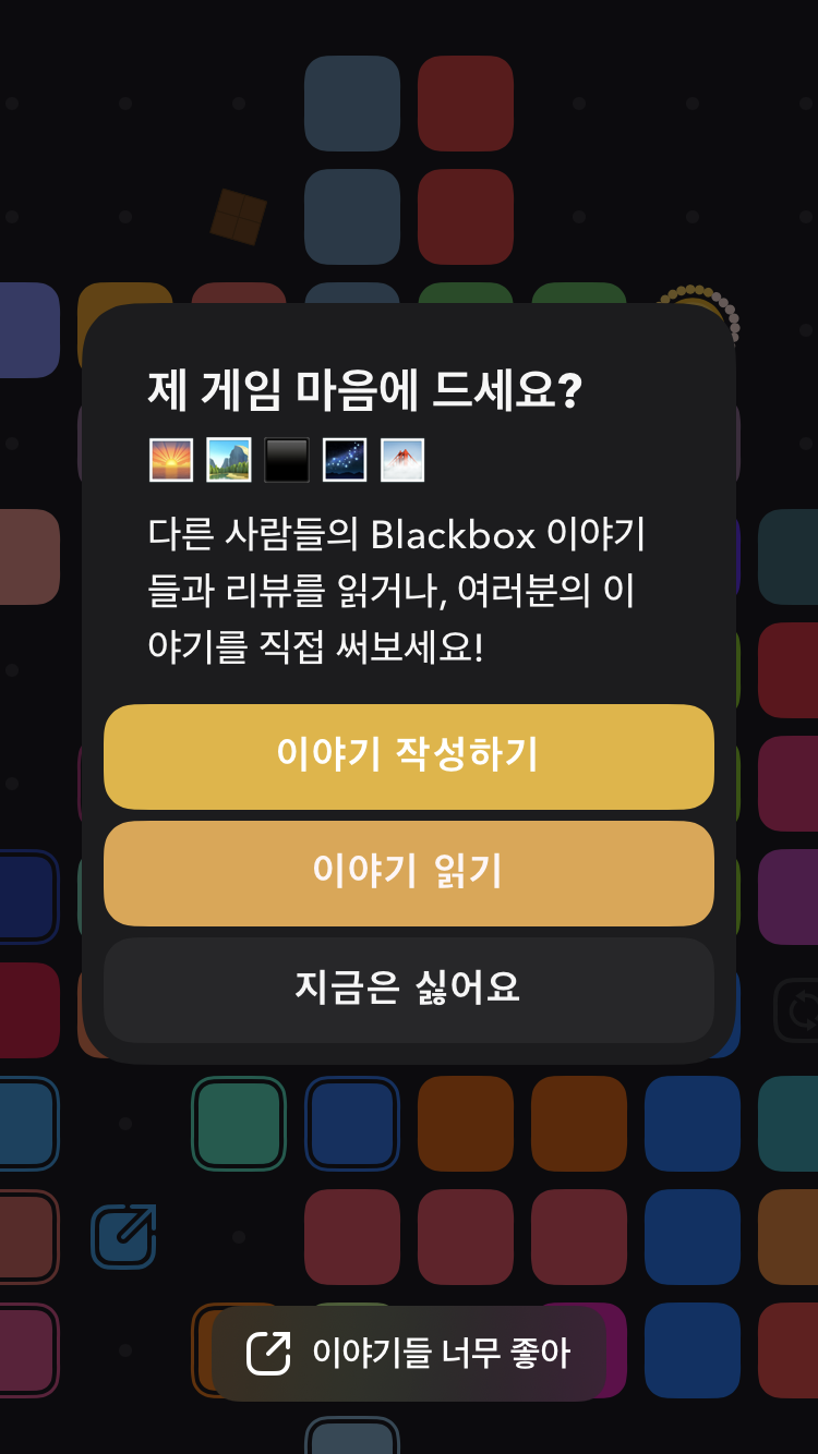 아이콘을 눌러 익스텐션으로 다른 연락처/메신저 앱 등으로 앱스토어 링크를 전송할 수 있으며, 전송받은 사람이 링크에 접속하면 Blackbox 앱을 다운로드할 수 있습니다. 링크 접속이 확인되면 무료 힌트 크레딧을 획득할 수 있습니다. (현재 중단)