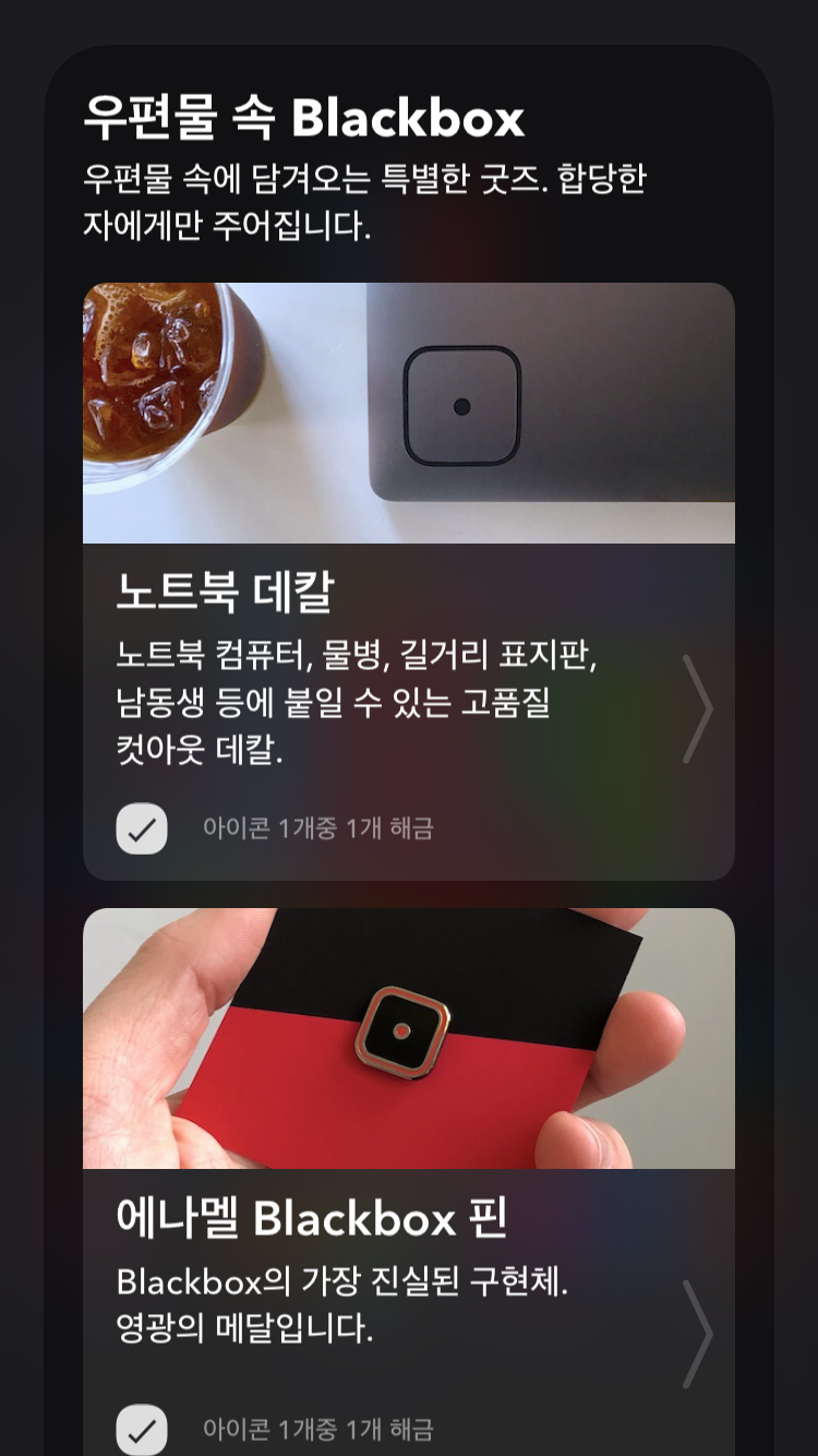 Blackbox의 로고가 새겨진 미니멀리즘 굿즈와 어패럴을 판매하고 있습니다. 처음 상점이 열렸을 경우 들어가보면 일부 항목은 구매가 막혀있는데, 챌린지를 진행하면서 일정 갯수마다 항목이 해금됩니다.