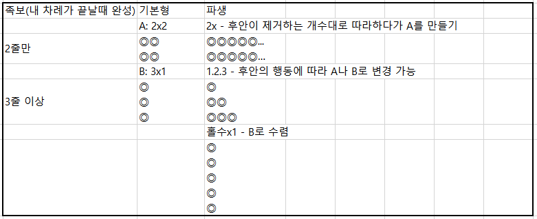 족보를 기억하고 있으면 형태를 만들기 쉬우니 보다 복잡한 판에서 기억하고 계시면 좋습니다.
