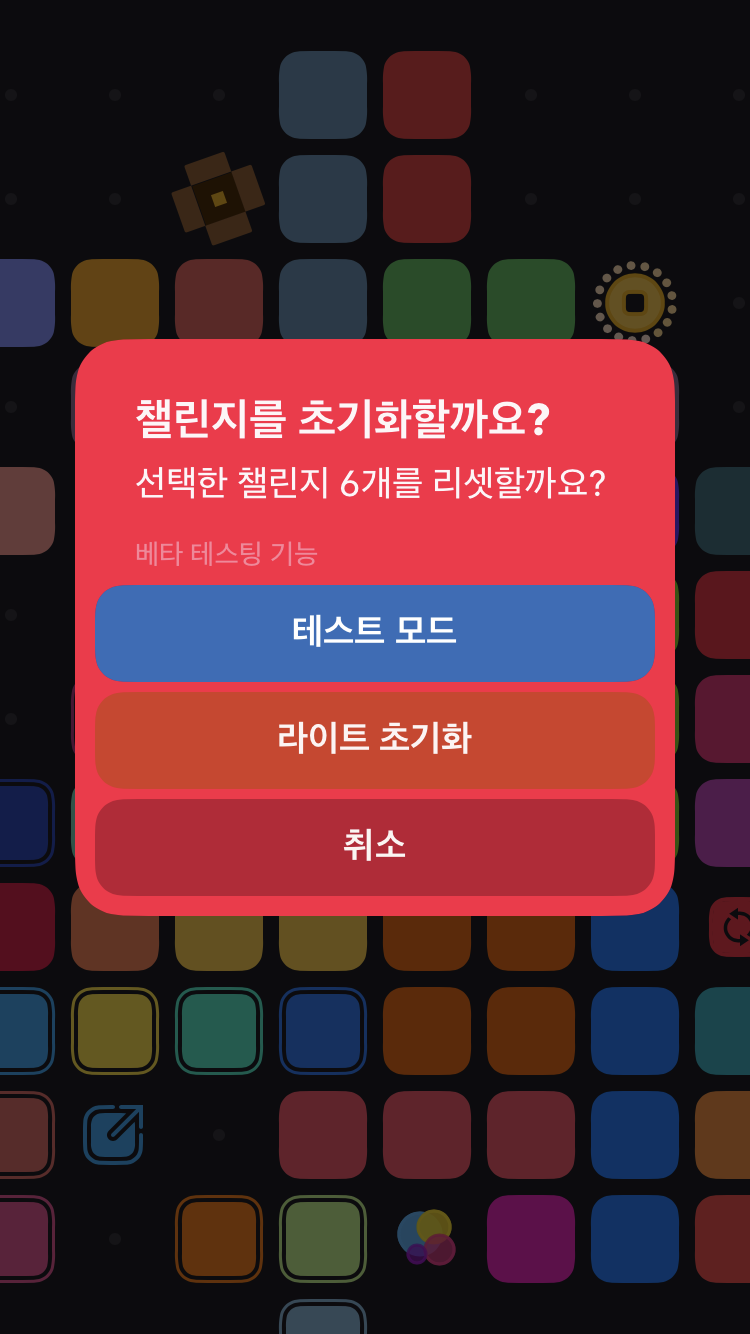 완료된 챌린지(색칠된 사각형)을 꾹 누르는 홀드를 실행하면 해당 챌린지 타입 전체를 리셋할 것이냐는 메시지가 뜨게 됩니다. 위 글에 설명된 리셋 기능과 동일하게 테스트 모드는 일회성으로, 그리드로 복귀하면 원상복구되는 리셋입니다. 라이트 초기화는 반영구적 리셋으로 다시 챌린지를 클리어해야 하며, 이미 게임센터 및 iCloud에 저장된 진행도 데이터와는 무관하게 초기화를 할 수 있는 기능입니다.